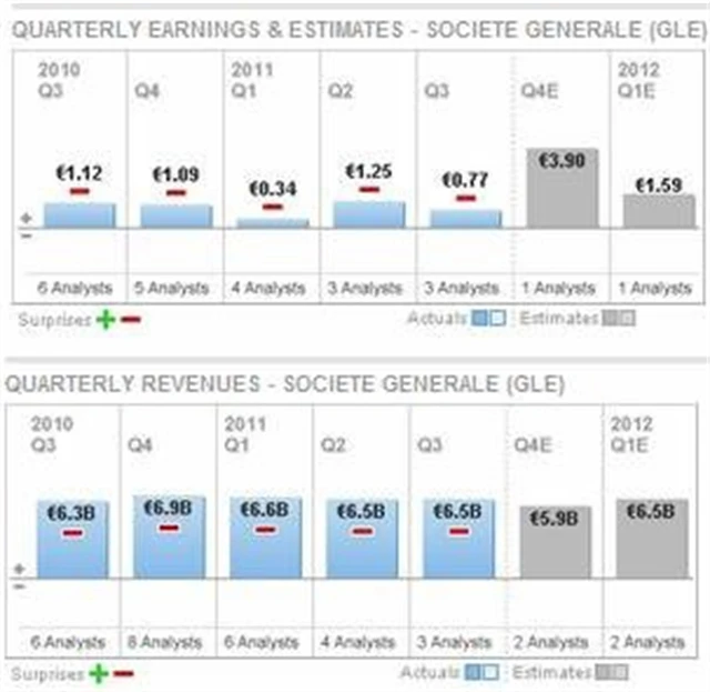 Vzhledem k poklesu korporátních a investičních aktivit a oznámení dalších odpisů státních dluhopisů očekávají analytici snížení zisku. Čistá expozice Société Générale v řeckém dluhu byla v říjnu 2011 660 milionů eur.