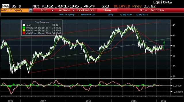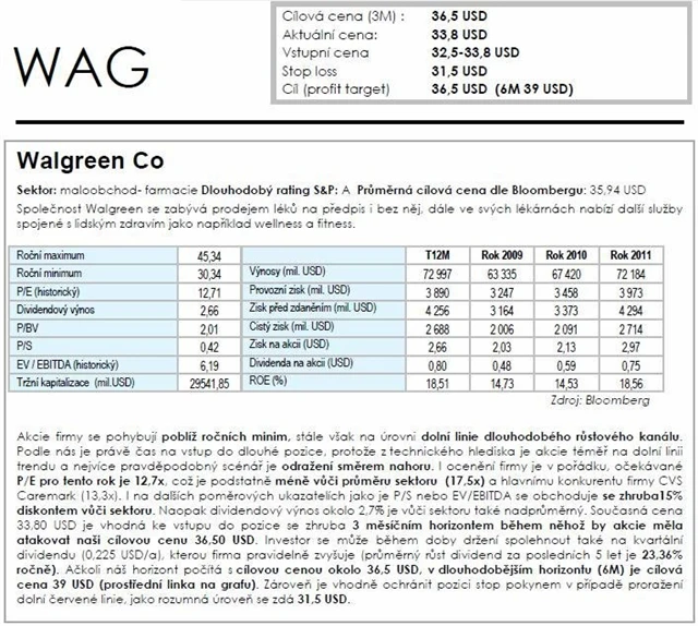 Společnost Walgreen se zabývá prodejem léků na předpis i bez něj, dále ve svých lékárnách nabízí další služby spojené s lidským zdravím, například wellness a fitness. Akcie firmy se pohybují poblíž ročních minim, stále však na úrovni dolní linie dlouhodobého růstového kanálu. Podle nás je čas na vstup do dlouhé pozice, protože z technického hlediska je akcie téměř na dolní linii trendu a nejvíce pravděpodobný scénář je odražení směrem nahoru.