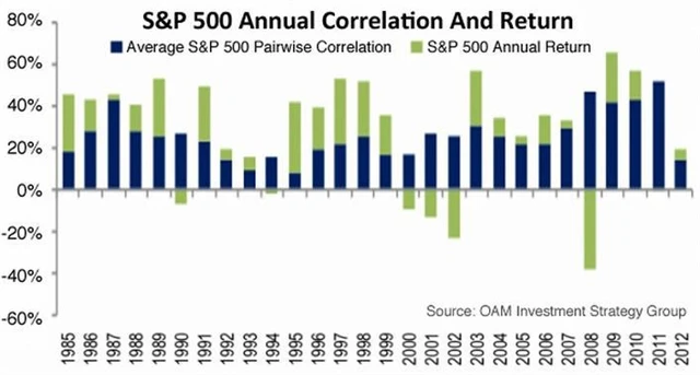 Jedním z velkých témat roku 2011 byla vysoká korelace akcií i dalších aktiv - klesaly i rostly víceméně ruku v ruce. Pro manažery fondů, ale i pro drobné investory proto bylo velice složité účinně rozdělit peníze v rámci portfolia do jednotlivých typů investic (tzv. alokace aktiv). Historicky vysoká korelace amerických akcií je však v úvodu roku 2012 minulostí - naopak se propadla na minimum za uplynulých 25 let. V rámci amerického akciového trhu je tak možné najít jak růstové tipy, tak možnosti spekulace na pokles, vše v jednu dobu a na jednom místě.