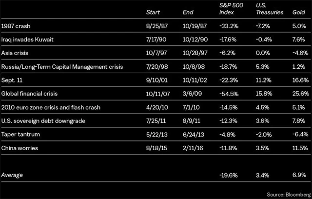 Druhým krokem byla analýza specifických událostí, které vedly k růstu averze k riziku. Délka těchto období byla dána pohybem indexu S&P 500 z vrcholu na dno. Vedle výkonnosti zlata a akcií je v tabulce ještě uvedena výkonnost státních dluhopisů.
