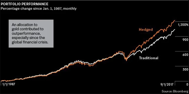 Přidání zlata vedlo ke zlepšení výkonnosti portfolia v posledních třiceti letech, a to konkrétně o 0,55 procentního bodu za rok. Volatilita sice mírně vzrostla, ale zmiňovaných 55 bazických bodů ročně vedlo v 30letém horizontu k poměrně velkému rozdílu.