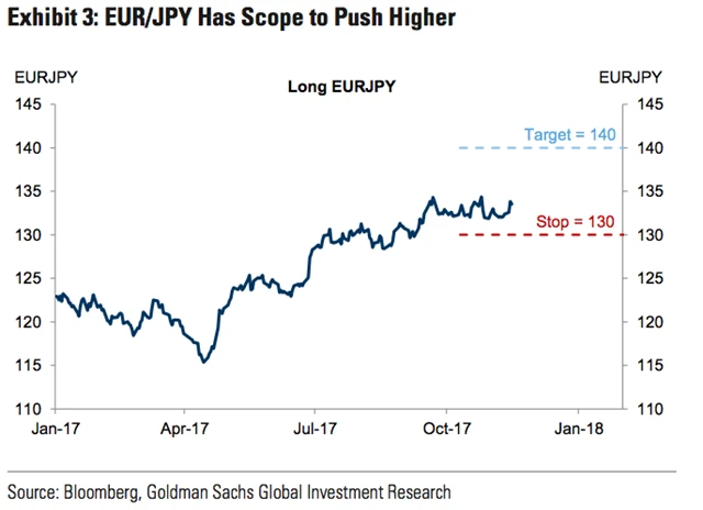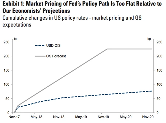 Podle GS bude výnos 10letého vládního dluhopisu USA růst v roce 2018 až k 3 %, kde byl naposledy v roce 2014. Prodej bondů je tedy nejlepší cestou, jak se zajistit proti růstu sazeb ze strany centrální banky. Trh přitom očekávané zvedání sazeb Fedu oceňuje mnohem níže (na základě výnosové křivky u jednodenních indexových swapů) než Goldman Sachs.