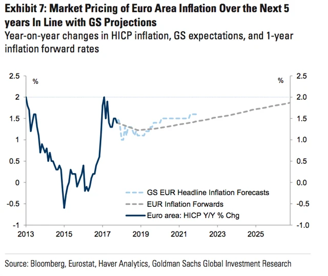 Spekulovat na růst inflace v eurozóně lze podle GS pomocí pětiletého inflačního swapu (5-year/5-year forward inflation) denominovaného v euru. Riziková prémie u očekávané inflace v eurozóně je nyní podle banky na nízké úrovni, a jde tak o ideální investiční příležitost, protože pokračující uvolněná politika ECB by měla být zárukou růstu spotřebitelských cen.