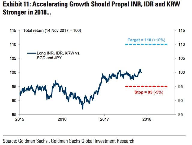 Koš asijských měn podle GS nabízí "diverzifikovanou expozici vůči silnému globálnímu růstu očekávanému v roce 2018" a několik býčích faktorů specifických pro jednotlivé země. Doporučení také využívá nízké výnosy, které nabízejí měny v "krátkém" koši, což by mělo zajistit financování obchodu.