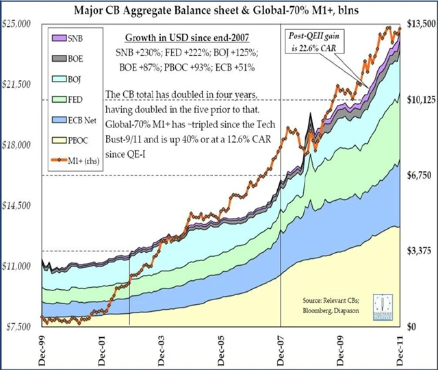 Růst bilancí centrálních bank ukazuje názorně přiložený graf. Ten by se v případě nastíněného scénáře stal doslova fraškou. Naštěstí, chtělo by se říct, protože je snad dostatečným varováním před přehnaným riskováním a nezodpovědným tištěním peněz.