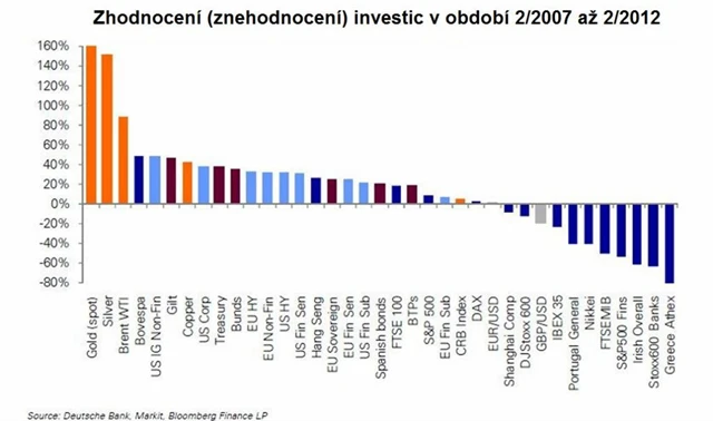 Analytici z Deutsche Bank vyhodnotili vývoj jednotlivých investic v uplynulých pěti letech a jasným vítězem se stalo zlato, na kterém se dalo vydělat 160 %. Další medailové pozice spekulací na růst obsadily také komodity (stříbro +150 %, ropa +85 %). Překvapením jsou velké výnosy bankovních dluhopisů z USA a Evropy (30 %, respektive 24 %). Dalo se také vydělat na akciích. Britské akcie vynesly 18 %, americké 8 %. Na "výchozí hodnotě" skončil po pěti letech měnový pár EURUSD. Poraženými (nejlepšími spekulacemi na pokles) se staly řecké akcie (-80 %) a akcie evropských bank (-60 %). Nejlepší období neměly například ani italské (-51 %) nebo japonské akcie (-41 %).