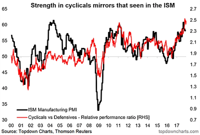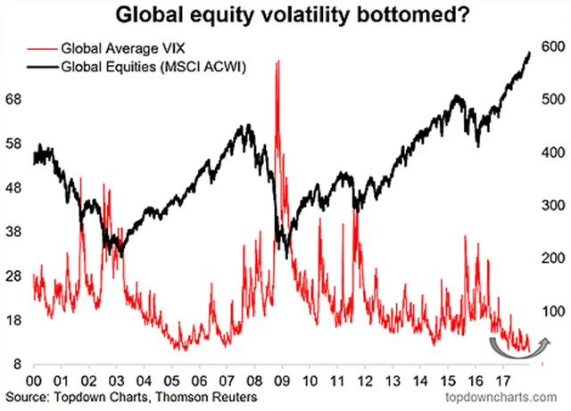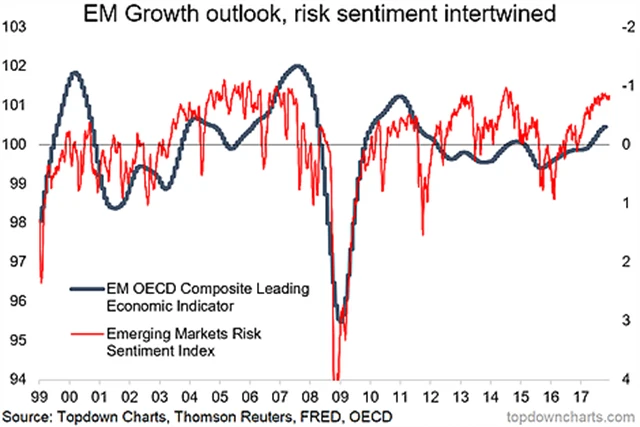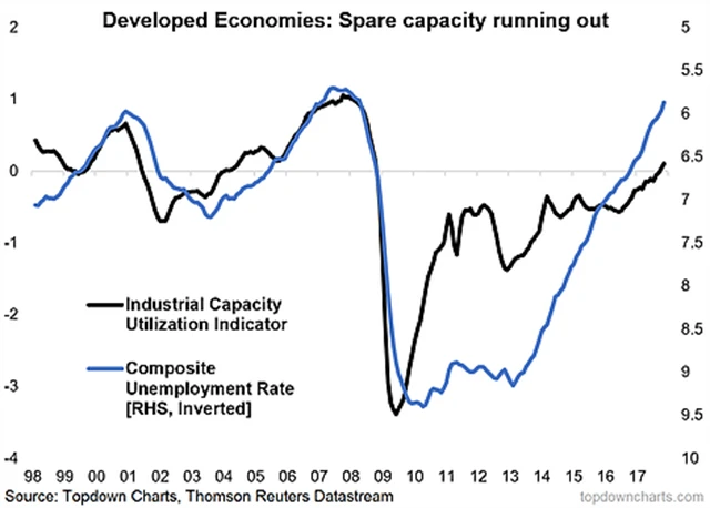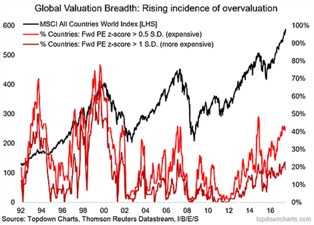 "Rok 2018 bude pro investory mnohem složitější než rok 2017. Růst ocenění napříč třídami aktiv, dozrávání ekonomického cyklu na globální úrovni a změny monetární politiky vybraných centrálních bank mohou z roku 2018 udělat rok zlomový," míní Callum Thomas z webu TOPDOWN CHARTS.