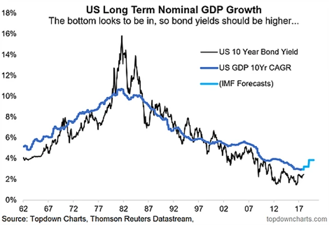 Výnosy desetiletých dluhopisů USA jsou na dlouhodobých minimech a zdá se, že již nemají kam klesat. Vzhledem k tomu, že i růst nominálního HDP v USA je na dně, výnosy by měly růst.