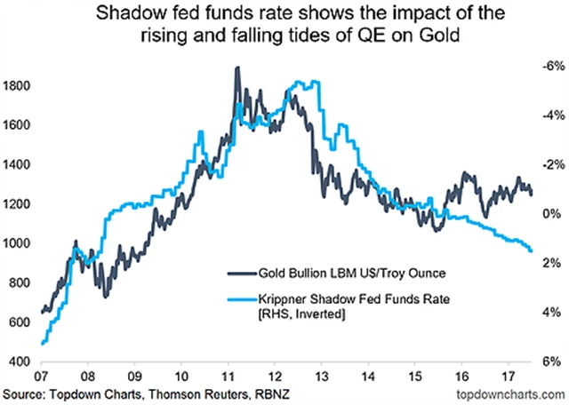 Graf ukazuje vztah takzvané stínové úrokové sazby Fedu, jež je využívána jako náhrada klíčové úrokové sazby, když ta je na nule a Fed se pustí do kvantitativního uvolňování, a ceny zlata. Růst této úrokové sazby (stejně jako plánovaný růst sazeb Fedu) má inverzní vztah s cenou zlata. A i když v posledním roce byl tento vztah narušen, pro zlato neznamená příliš pozitivní vyhlídky.