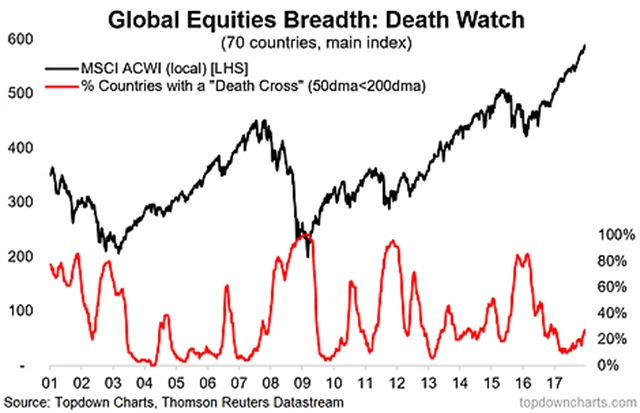 Graf níže zobrazuje procento trhů (z celkového počtu 70), u nichž se objevil takzvaný kříž smrti (situace, kdy se 50denní klouzavý průměr dostane pod 200denní klouzavý průměr). Podle Calluma Thomase jde možná o nejkomplexnější pohled na globální akcie a klíčový graf včasného varování před obratem trendu. Většinou se tyto kříže totiž objevují v dohledné době před začátkem korekce.
