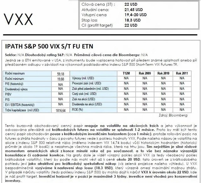 Na úvod jeden jazykolam, možná i hlavolam: IPATH S&P 500 VIX S/T FU ETN. A teď k věci: Jde o ETN emitované v USA, z instrumentu bude vyplacena hotovost při předem známé splatnosti anebo připředčasném odkupu v závislosti na výkonnosti podkladového indexu S&P 500 Short-Term VIX Futures TR. Tento burzovně obchodovaný cenný papír reaguje na volatilitu na akciových trzích a jeho výkonnost je odvozována převážně od krátkodobých futures na volatilitu se splatností 1-2 měsíce. Podle našeho názoru je volatilita akcií z indexu S&P 500 relativně nízko (měřeno indexem VIX okolo 14 bodů) vůči historickým hodnotám (historický průměr je okolo 19 bodů) a nezahrnuje všechna rizika, která na trhu jsou.