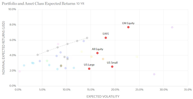 Analytici očekávají, že nominální roční zhodnocení amerických akcií se bude v příštích deseti letech pohybovat mezi 2 a 3 %, zatímco v případě rozvinutých trhů v Evropě, Austrálii, Asii a na Blízkém východě (EAFE) by se mělo pohybovat nad 4 %. V případě rozvíjejících se trhů by mělo dosahovat dokonce téměř 8 %, v tomto případě však při výrazně vyšší volatilitě.