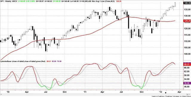 První graf ukazuje extrémní býčí náladu. Vychází z dat Investors Intelligence, MarketVane, Americké asociace individuálních investorů a put/call ratia. Dokud se bude držet nad linkou se zelenou šipkou, akcie by měly dále posilovat, nehledě na fázi probíhající rally. Nejlepší čas prodávat je zhruba v týdnu poté, kdy se křivka dotkne zmíněné linie. Ovšem jde samozřejmě o ideální, "ukázkový" průběh, ne o skálopevné pravidlo.