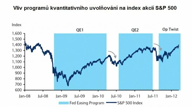 O tom, že programy kvantitativního uvolňování, ať už se jmenují jakkoli (QE1, QE2, Twist), pomáhají růstu rizikových typů investic, jako jsou akcie či komodity, pochybuje málokdo. Investoři by se měli mít především na pozoru, když některý z těchto programů zrovna končí, jako zrovna nyní operace Twist, protože jak nekompromisně ilustruje graf analytiků Barclays Capital, po konci takového programu následuje zpravidla prudký propad cen akcií.