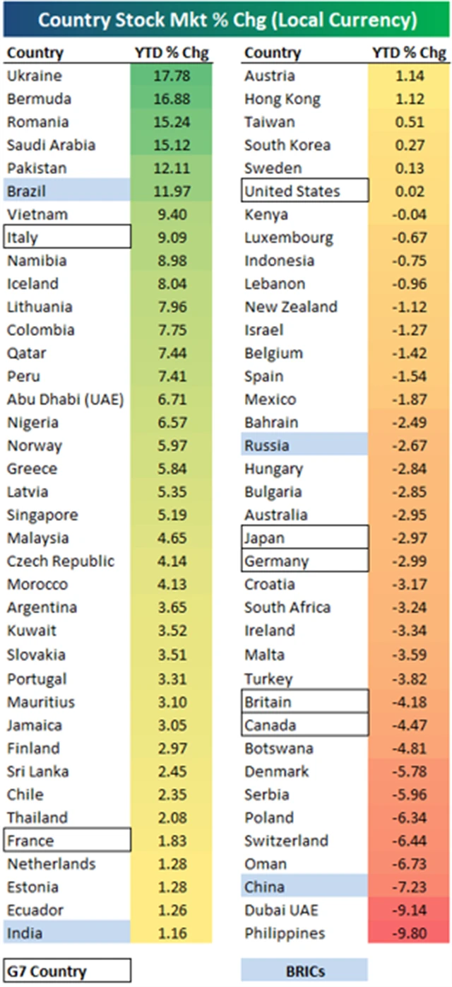 Jaké akciové trhy nabídly letos do 20. dubna včetně nejlepší zhodnocení v lokálních měnách? Ukrajina, Bermudy, Rumunsko, Saúdská Arábie a Pákistán. Šestá je Brazílie a osmá Itálie, což je ze zemí, které na tržní mapě něco více znamenají, pro první desítku vše. Česká republika se drží v první třetině pomyslného pelotonu, většina těžkých vah světového burzovního žebříčku je v jeho druhé polovině.