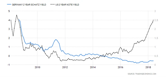 Výnosy amerických a německých dluhopisů se liší nejvíce od roku 1989. Investoři takto ocenili dvouleté bondy v reakci na údaje o růstu ekonomik obou zemí. Americká příjemně překvapila, což přiživilo sázky na další zvýšení úrokových sazeb Fedu (do tržních cen je dnes započítána 95% pravděpodobnost zvýšení sazeb v červnu a 72% v září). Německo, které je bráno jako proxy Evropy, naopak v prvním čtvrtletí posílilo jen o 0,3 %, což znamená zpomalení, a navíc výraznější, než se čekalo.