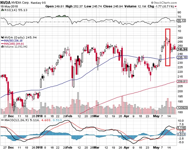 Přehnaná očekávání na americkém trhu ilustruje přechodný propad více než poloviny firem, které svými výsledky za 1Q2018 překonaly odhady trhu. Evidentně ne dostatečně. Výrobce čipů NVIDIA například den po zveřejnění výsledků ztrácel, když jeho zisk na akcii překonal odhady analytiků "jen" asi o půl dolaru (podle Jima Cramera byl ke spokojenosti potřeba celý dolar). NVIDIA se ale záhy dostala na(d) původní pozice, což podle části trhu jen potvrzuje zdravý fundament a potenciál dalšího růstu.