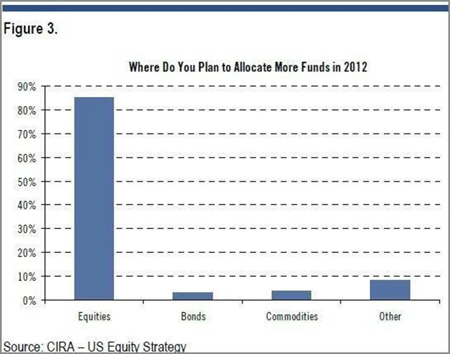 Navzdory několika nepovedeným dnům se tábor akciových býků má stále o co opřít. Jak ukazuje graf, velcí investoři (Citigroup oslovila 115 velkých institucionálních hráčů) mají akcie v hledáčku a plánují do nich teprve začít výrazněji investovat. Není se co divit - jak upozorňuje Thomas Lee z JPMorgan, na akciové rally, která začala v březnu 2009, se drobní investoři sdružení v podílových fondech podíleli jen minimálně. Nízký objem obchodů proto považuje za býčí signál.
