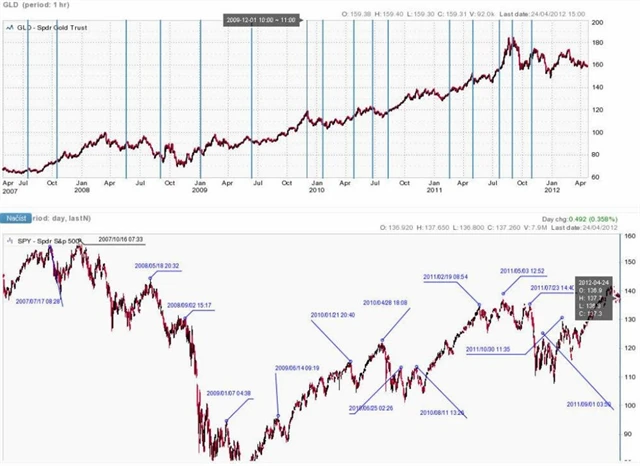 Na prvním grafu je cena GLD (SPDR Gold Trust) a SPY (ETF na S&P 500). Data uvedená v dolním grafu jsem zvolil jako okamžiky pro porovnání následného cenového vývoje SPY a GLD. Jednalo se o 16 období poklesu u SPY v období 7/2007 až 10/2012. Bral jsem tedy v úvahu i lokální kratší poklesy trvající někdy jen okolo deseti dnů.