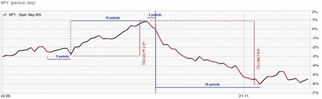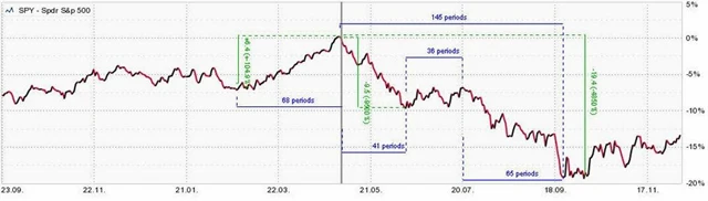 V případě SPY byl průměrný pokles dlouhý 28 dní a cena během něj spadla v průměru o 6,9 %. Před dosažením vlastního cenového vrcholu trval poslední krátký růst ceny v průměru 19 dní a SPY dosáhl 3,7% přírůstku.