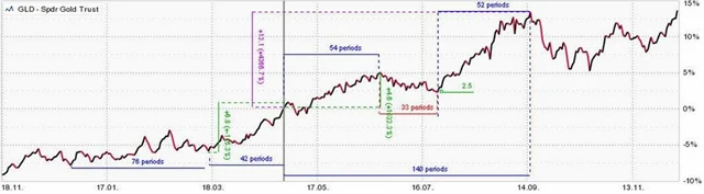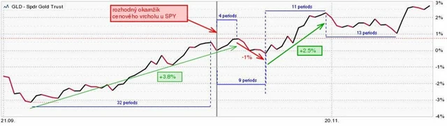 Situace u zlata ve stejných obdobích: Zlato je bezpečným přístavem a u střednědobých korekcí to platí ještě více. Cena zlata rostla poměrně silně již 42 dnů před dosažením vlastního vrcholu u SPY a pak dalších 54 dnů po něm. Za 140 dnů po cenovém vrcholu u SPY byla cena u GLD vyšší o 13 %.