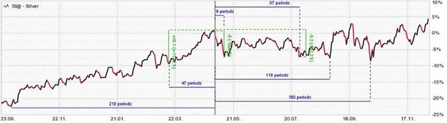 Podle následujícího grafu se zdá, že se stříbro chová téměř jako akcie. Nejhlubší poklesy dosáhly u stříbra po 118 dnech od maxima u SPY zhruba 8 %, stejná ztráta se ovšem vyskytla poprvé již po 9 dnech od cenového vrcholu. Je to tedy výrazně méně než u SPY. V tom je stříbro lepší volbou. Ale žádná výhra to určitě není. Stříbro je tedy zřejmě především průmyslový kov, to je potřeba třeba brát v úvahu.