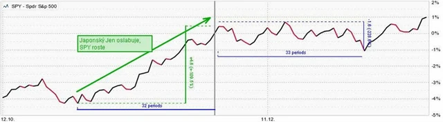 Je to vidět i z následujícího grafu, který ukazuje chování ETF SPY poté, co japonský jen začne silně posilovat. Vybral jsem zhruba 10 takových období od března 2009. 32 dnů před zahájením posilování SPY v průměru silně rostl, během posilování jenu jeho růst stagnoval. Cena skončila v průměru po 33 dnech na -1,6 %. Podotýkám, že jde o vývoj během dlouhodobého růstového trendu u akcií. Vyplatí se tedy určitě sledovat jen. Jakmile je tendence k jeho posilování, má zlato tendenci posilovat také.