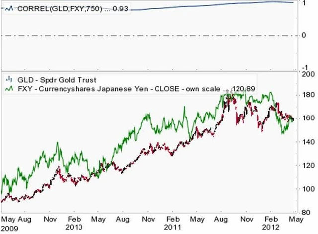 Cena GLD a FXY (FXY je ETF na japonský jen) - v grafu je vypočtena korelace mezi oběma aktivy za 750 dnů. Výsledek je 0,93, což je skutečně vysoká závislost. 750 obchodních dnů jsou přibližně tři roky, tedy období celého býčího trhu od března 2009.