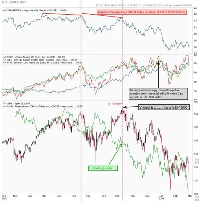 Na grafu vidíme vrchol trhu v roce 2007. Situace odpovídala popsanému schématu. Dlouho před hlavním vrcholem byly cyklické akcie (EARLY CYCLICALS) slabé (SMART INDEX nahoře), materiálové akcie dokonce vrcholily až po hlavním vrcholu S&P 500, stejně tak ropa a energie. Slabý byl i dolar.
