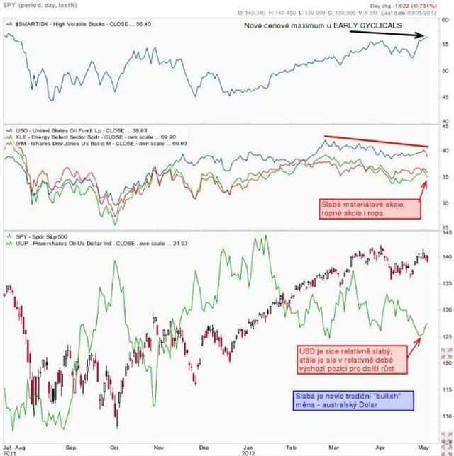 Závěr: Pokud zůstává v platnosti teorie o rotaci aktiv a výkonnosti jednotlivých sektorů během býčího trhu, neměli bychom být na cenovém vrcholu. Měl by přijít další růst. Faktem je, že slabost materiálových a energetických akcií a ropy je dána také problémy Číny, neradostnou situací v Evropě a "špatným" obdobím z hlediska sezónnosti (květen až říjen typicky slabší).