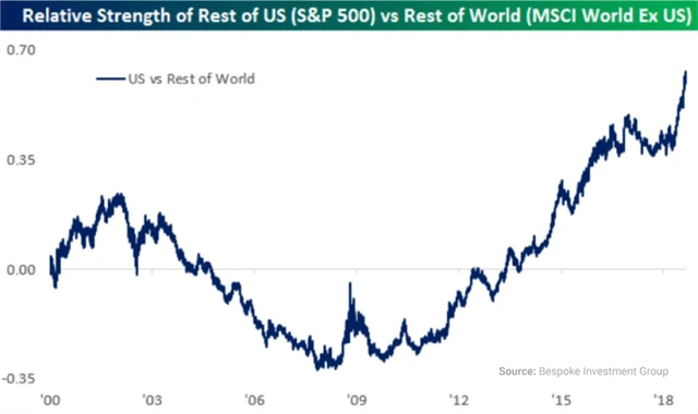 Americké akcie svým výkonem překonávají zbytek světa nejvíce za 18 let. Znamená to, že příležitosti se zajímavým oceněním jsou mimo Spojené státy. Tvrdí to alespoň Niladri Mukherjee, šéf portfoliových strategií v Merrill Lynch Wealth Management.