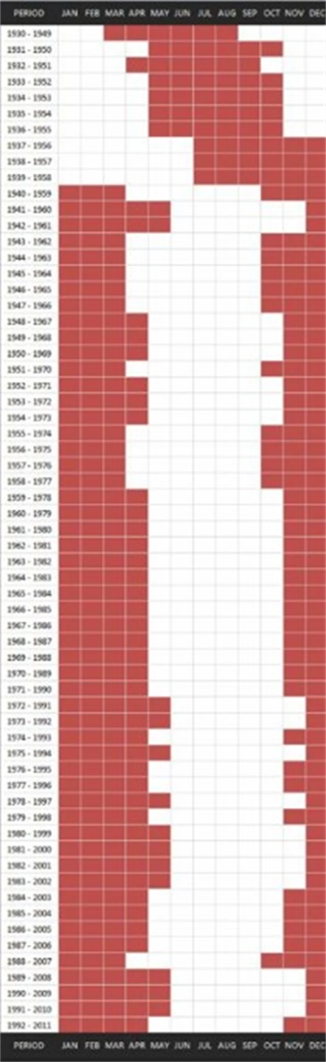 Názorů na to, zda se v letošním roce naplní burzovní přísloví "Sell in May and go away", jsou plná investiční média. Úsloví investorům radí, aby se v květnu minimálně do podzimu, kdy začíná naopak historicky nejlepší období pro akcie, akcií zbavili. Zajímavou "grafickou evoluci" nejlepších šesti měsíců v roce během uplynulých 80 let nabízí studie analytické společnosti MarketSci. Každý řádek v grafu ukazuje průměr dvaceti let, červená políčka pak pro akcie nejlepších šest měsíců v roce.