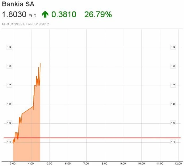 Včera jsme psali o hrůzostrašném propadu ceny akcií jedné z největších španělských bank Bankie. Ve čtvrtek přišlo navíc snížení ratingů šestnácti španělských bank včetně Santanderu. A hle - páteční dopoledne je ve znamení posilování bankovních akcií, i když mírného. Investoři možná doufají, že něco "velkého" předvedou politici na summitu G-8 o víkendu, případně 23. května zástupci zemí eurozóny na mimořádném summitu. Co na to Bankia?