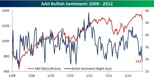 Nejprve to byli investiční stratégové, kteří začali doporučovat snížit podíl akcií v portfoliích na nejnižší úroveň od března 2009, kdy začal poslední velký býčí trh. Podle Bespoke Investment Group jsou to nyní američtí individuální investoři (AAII), jejichž býčí nálada je na dlouhodobém minimu, konkrétně na úrovni srpna 2010. Pokud patříte k takzvaným kontrariánům, kteří s oblibou sázejí proti trhu, nepotřebujete lepší signál k nákupu akcií.