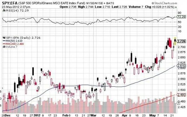 Rychlý růst amerických akciových trhů v závěru středečního obchodování měl za následek kromě jiného nové maximum na grafu, který měří výkonnost amerického akciového indexu S&P 500 vůči indexu EFA, který sdružuje velké zahraniční společnosti. Maximum na grafu neznamená nic jiného, že investoři, když už jdou do akcií, preferují ty velké americké před těmi neamerickými.