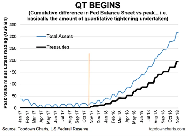 Fed se v současnosti zbavuje měsíčně aktiv za 50 miliard USD. Vliv QT na dluhopisový trh již mohou investoři pociťovat a v nejbližší době se něco podobného bude dít i na trhu s americkým dolarem. Podobné je to na akciovém trhu, kde se z centrální banky stává příčina volatility, zatímco donedávna její aktivita kolísavost cen spíše brzdila.