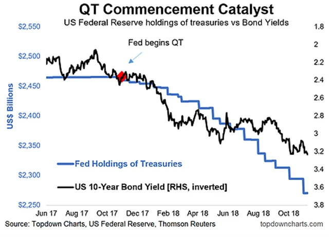 Z dalšího grafu je patrné, že QT zafungovalo jako katalyzátor zvyšování úrokových sazeb a výnosů dluhopisů. Přísně vzato, z hlediska finančních toků a vztahu poptávky a nabídky by mělo QT působit opačně. Jde totiž o opatření, které zpomaluje ekonomiku, tím pádem také inflaci a nakonec by mělo vést k poklesu výnosů. V současnosti ale působí spíše jako prorůstový faktor u výnosů dluhopisů (ceny klesají z důvodu vyšší nabídky).