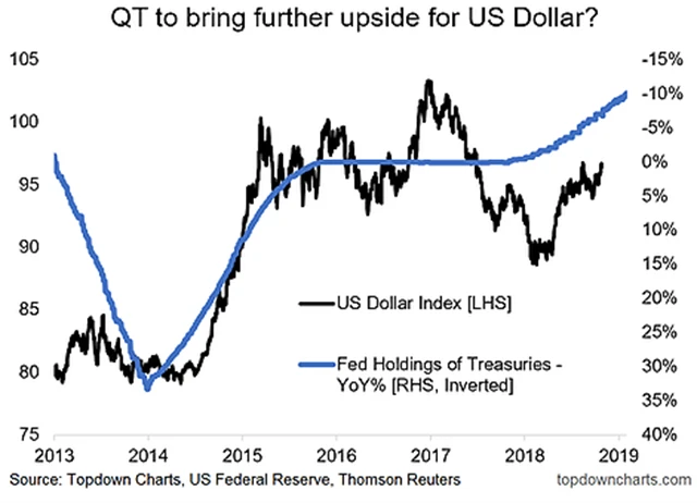Společně s úrokovými sazbami by mělo být QT silným býčím faktorem pro americký dolar. Pokud bylo QE v minulosti považováno za nástroj vedení měnových válek a vedoucí k oslabování měny, dnes je QT jedním ze silných argumentů pro posilování dolaru.