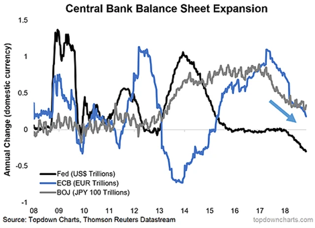 Fed je ve zpřísňování měnové politiky nejdále. ECB omezuje nákupy aktiv a centrální banka v Japonsku to dělá o něco nenápadněji. Trend vývoje politiky všech tří nejsledovanějších měnových autorit je ale poměrně jasný.