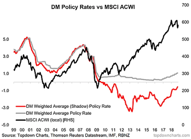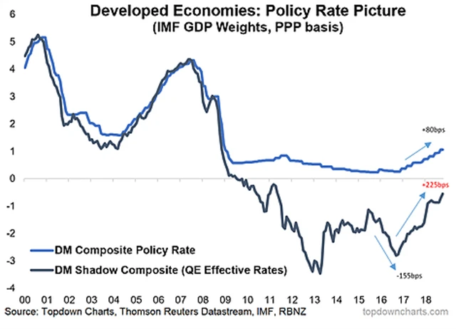 Jedním ze způsobů, jak posuzovat dopad QT na finanční trhy, je vývoj stínových sazeb, tedy efektivních sazeb, jež počítají s vlivem QE. Na grafu jsou kombinované sazby (stínové i nominální) v rozvinutých ekonomikách. Na rozdíl od nominálních sazeb, které od začátku QT vzrostly o méně než 100 bazických bodů, ty stínové vzrostly o více než 220 bazických bodů. Změny v rozvahách centrálních bank tedy mají citelný dopad na reálné úrokové sazby.