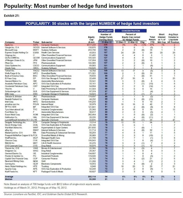 Tabulka nejpopulárnějších akcií odráží stav portfolií hedgeových fondů k 31. březnu 2012. Dominantní postavení si již několik čtvrtletí v řadě udržují akcie Applu, které drží 226 hedgeových fondů. Na druhém místě je společnost Google. Na třetím místě jsou akcie společnosti Microsoft, které má v portfoliu 161 fondů. Na čtvrtém místě jsou akcie firmy Express Scripts Holding (ESRX), které drží 157 manažerů hedgeových fondů.