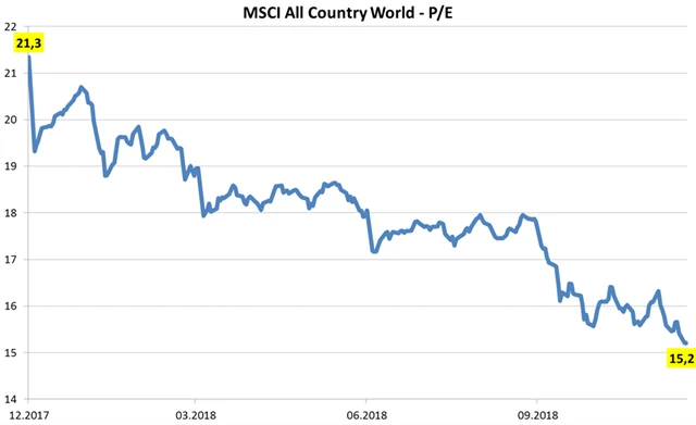 Na druhou stranu se s ještě větší a obrácenou negativní intenzitou projevil dramatický pokles ocenění podle P/E o 28,8 %. Zatímco ještě na konci roku 2017 se globální akcie obchodovaly za 21,3násobek zisků, aktuálně se obchodují pouze za 15,2násobek. Jsou to právě výrazně nižší valuace, které stojí za naším opatrně pozitivním výhledem pro akcie pro rok 2019.