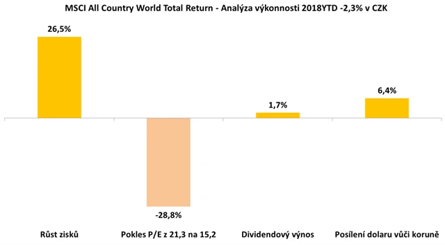 Třetím, tradičně stabilním a mírně pozitivním faktorem pro výkonnost akcií byl dividendový výnos, který od začátku roku z globálního pohledu dosahuje 1,7 %. Tyto tři faktory se skládají do celkové 8,2% ztráty globálního akciového indexu. Korunová ztráta je nižší o efekt kurzových změn.