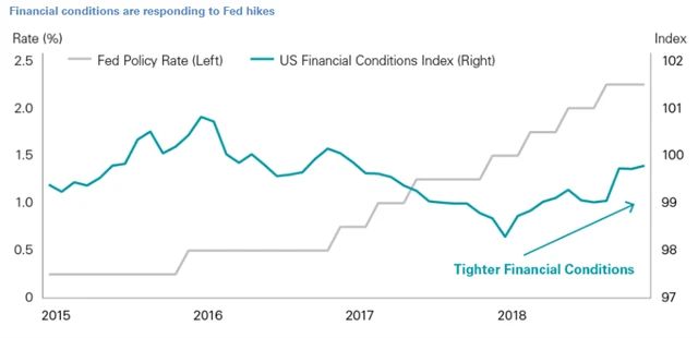Jednou z hlavních otázek, kterou si investoři a ekonomové kladou, je to, jak bude Fed postupovat v oblasti měnové politiky. Podle Goldman Sachs lze letos čekat tři zvýšení sazeb (připomínáme, že jde o výhled vydaný již v prosinci 2018 - pozn. red.), zároveň ale se zpřísňováním finančních podmínek a se zpomalováním růstu ekonomiky roste pravděpodobnost toho, že Fed se zvyšováním úroků skončí dříve, než měl v plánu. Na druhé straně ale situace na trhu práce a růst inflace mohou Fed přinutit ke zvedání sazeb v každém čtvrtletí.