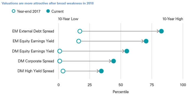 Rok 2019 by měl být podle Goldman Sachs pro investory lepší než ten uplynulý. Může tomu pomoci pokračující dobrý ekonomický růst, což platí zejména mimo USA. Především v rozvíjejících se zemích je stále prostor pro zlepšení ekonomických podmínek. Vzhledem k poklesu očekávání v ekonomice i na finančních trzích je větší prostor pro pozitivní překvapení, zatímco loni byla očekávání příliš vysoká a většina neočekávaných situací vyzněla negativně. Pomoci by letos měly také atraktivnější valuace aktiv poté, co reakce investorů na konci roku 2018 byly přehnané a neměly daleko k panice.