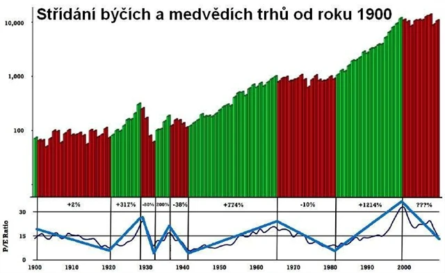 "Sekulární býčí trh začíná, když se P/E odrazí od svého dna a začne růst na hodnotách pod svým dlouhodobým průměrem. Medvědí trh naopak začíná za vrcholem P/E nad dlouhodobým průměrem. Navzdory poklesům akciového trhu v uplynulé dekádě se P/E drží nad svým průměrem a stále klesá, což naznačuje, že je trh stále v dlouhodobé medvědí fázi."