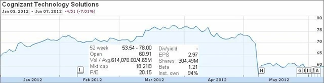 Akcie zaznamenala silné výprodeje v květnu, kdy společnost snížila guidance růstu tržeb na "pouhých" 20 % za rok. Zatímco se zdá, že výdaje podniků na IT technologie zpomalují, což bude mít nepříznivý dopad na růst, silný příklon k IT outsourcingu by měl v následujících letech tržby a zisky podpořit.