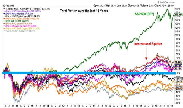 Už ani to, že USA představují "pouze" polovinu světového akciového trhu, nemusí být dostatečný důvod pro diverzifikaci. Oblíbeným argumentem, proč se vyhýbat trhům mimo USA, je to, že polovina příjmů amerických firem stejně pochází ze zahraničí, takže diverzifikace je vlastně automatická. Vzhledem k tomu, že prakticky všechny podstatné centrální banky svým přístupem vytvářejí dojem, že akciím jednoduše nedovolí padnout, mohou mít investoři opravdu pocit, že je diverzifikace zbytečná.