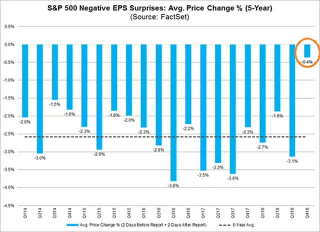 Vzhledem k výsledkům amerických akcií se není co divit, Je tu ovšem (minimálně) jeden problém - investoři si tak trochu přestali všímat špatných zpráv. V minulosti reagoval index S&P 500 na špatné zprávy o firemních ziscích na akcii (EPS) průměrným poklesem o více než 2,5 %. Nyní je to ani ne půl procenta.