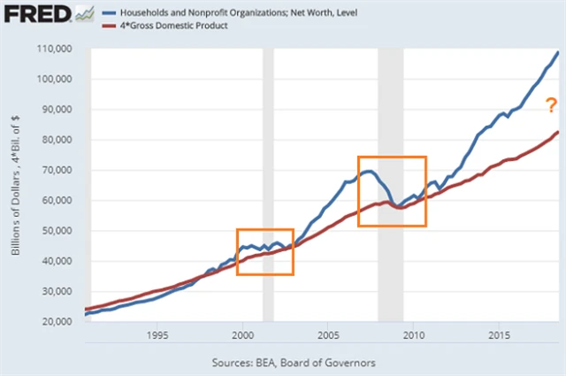 Investoři si neuvědomují, že centrální banky nemají neomezenou moc chránit trhy před medvědími trendy. Při pohledu na hodnotu čistého majetku amerických domácností a její možný návrat k linii ekonomického trendu se zdá být optimismus investorů poněkud přehnaný. V nejlepším případě lze očekávat dlouhé období stagnace, spíše to ovšem vypadá na výraznější propad cen akcií, dluhopisů či nemovitostí.